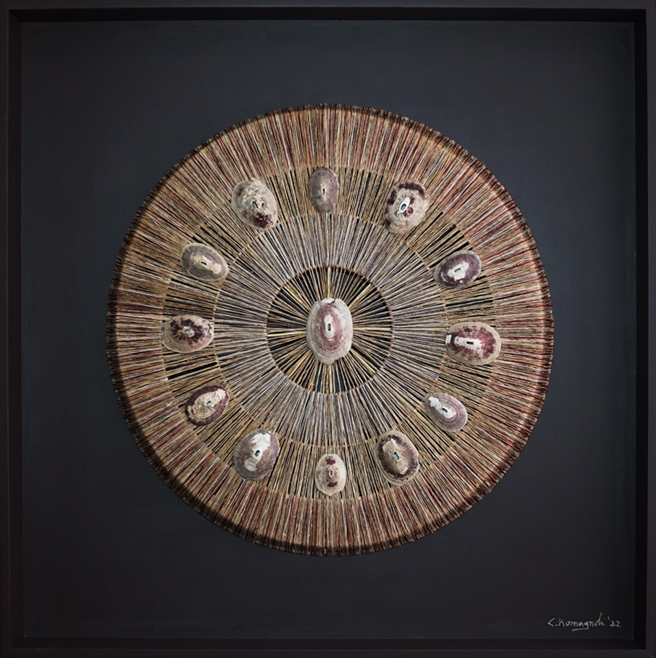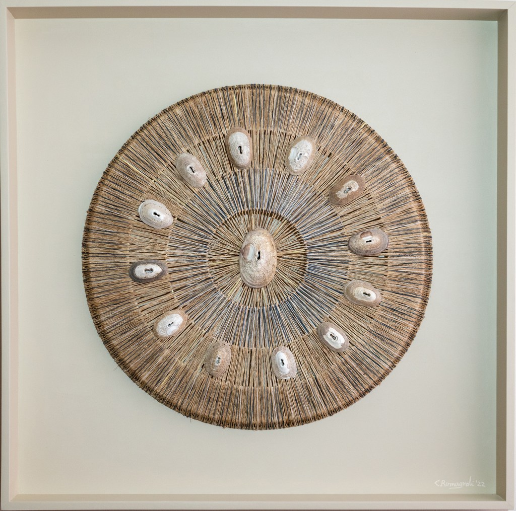Artworks of textile art in the shape of a mandala, using sisal, jute, linen, silk, cotton cords, raffia and other natural fibers that welcomed and highlighted the beauty of sea shells.
